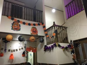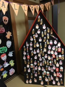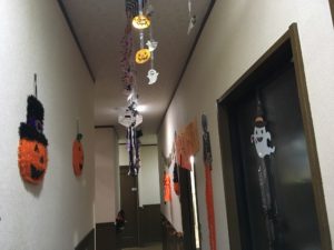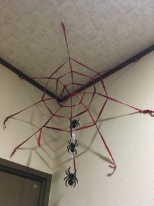 にじのわをおもいっきり飾りつけして、更に、みんなで変装し、ハローウィンパーティを行いました! 部屋中に張り巡らされた蜘蛛の巣やお菓子の家は非常にインパクトがあり、子供たちも喜んでくれていました!